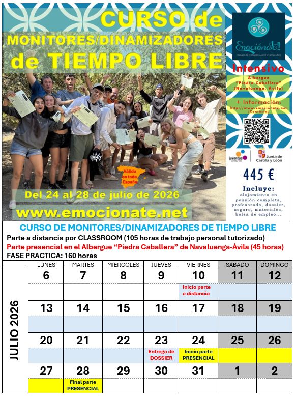CURSO DE MONITORES/DINAMIZADORES DE TIEMPO LIBRE – PARTE PRESENCIAL (45 h) del 24 al 28 de julio en el Albergue “Piedra Caballera” recreando la experiencia de un campamento de verano. Parte a distancia por CLASSROOM (105 horas de trabajo personal tutorizado) entre el 10 y el 23 de julio de 2026.