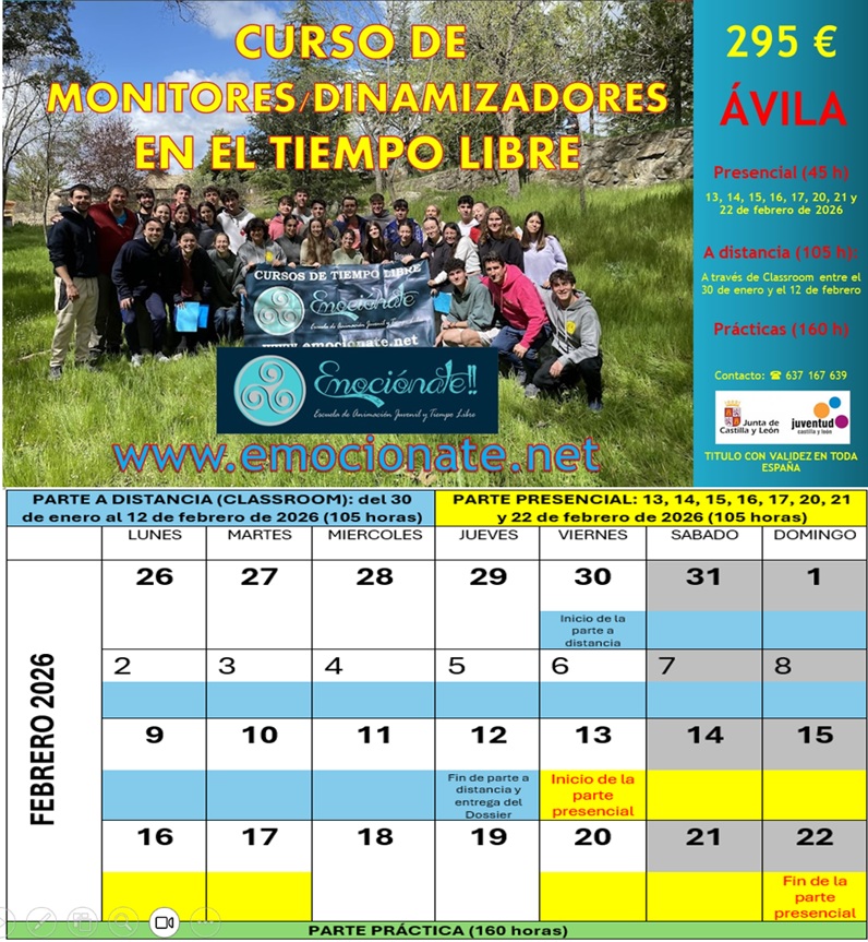 CENTRO SAN VIATOR VALLADOLIDCURSO DE MONITORES/DINAMIZADORES DE TIEMPO LIBRE - PARTE PRESENCIAL (45 h) los días 13, 14, 15, 16, 17, 20, 21 y 22 de febrero en la ciudad de VALLADOLID. Parte a distancia por CLASSROOM (105 horas de trabajo personal tutorizado) entre el 30 de enero y el 12 de febrero de 2026. (Acción Formativa pendiente […]